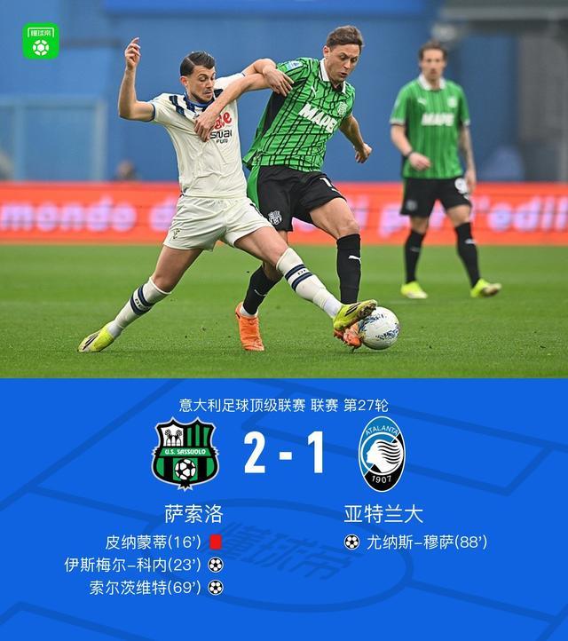 北京時間3月1日意大利足球頂級聯賽第27輪,薩索洛主場迎戰亞特蘭大。比賽中,一名薩索洛球員因違紀被紅牌罰下,隨後薩索洛憑借兩次團隊配合,由伊斯梅爾-科內、索爾茨維特先後建功;亞特蘭大則在比賽末段通過配合由尤納斯-穆薩打入一球。最終薩索洛以2-1的比分擊敗亞特蘭大。